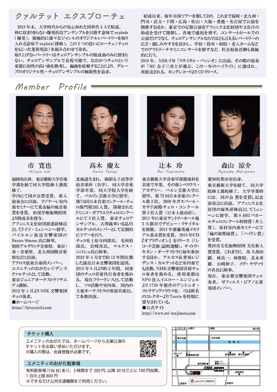NHK交響楽団・東京都交響楽団などで活躍するチェロ奏者4人(市寛也・髙木慶太・辻本玲・森山涼介)で結成された「クァルテット・エクスプローチェ」のコンサートが、ユメニティのおがたで開催。