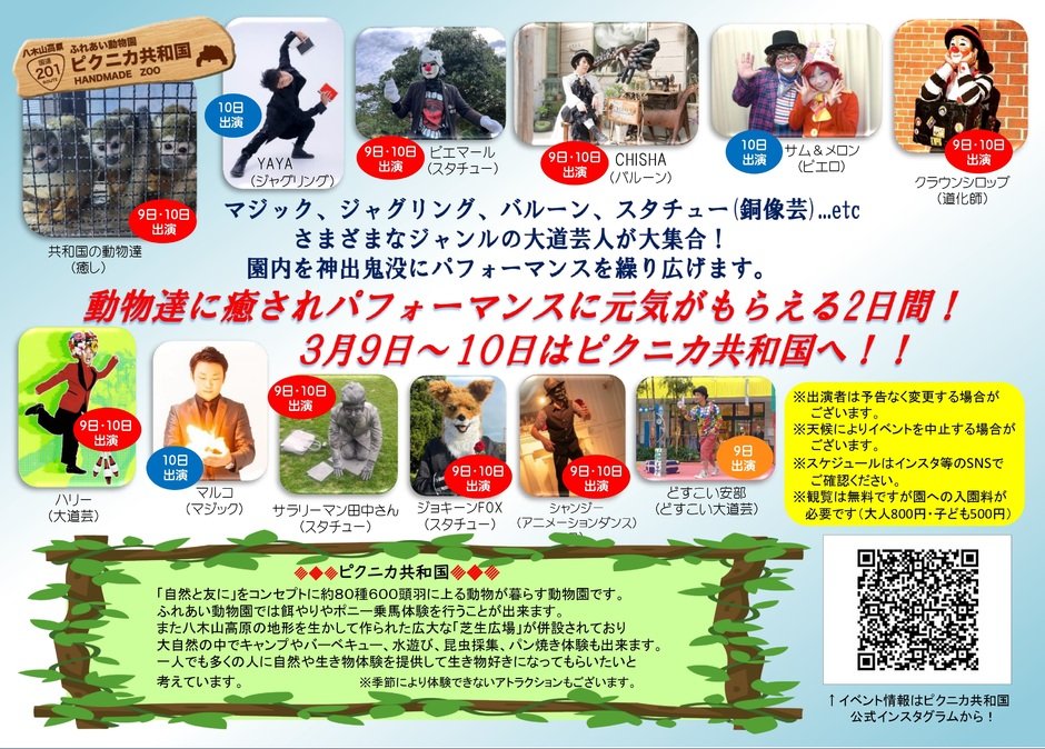 ふれあい動物園ピクニカ共和国に大道芸人達が大集合!
