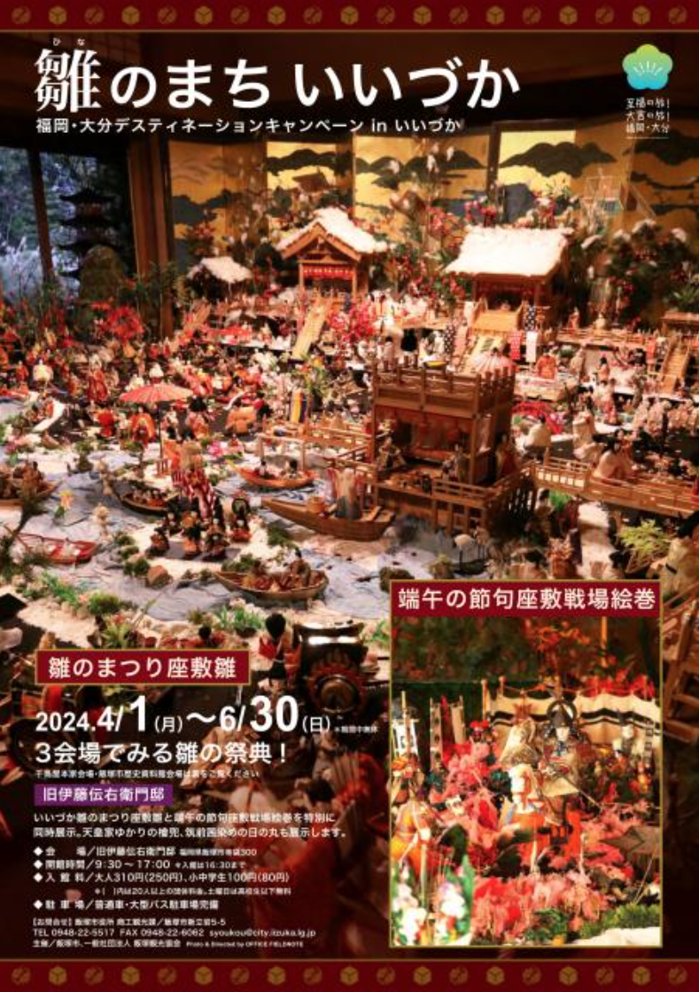 期間中は特別に2月・3月雛のまつりの「座敷雛」、5月端 午の節句の「戦場絵巻」を同時展示!天皇家ゆかりの「檜 兜」、筑前茜染めの日の丸国旗も展示します。