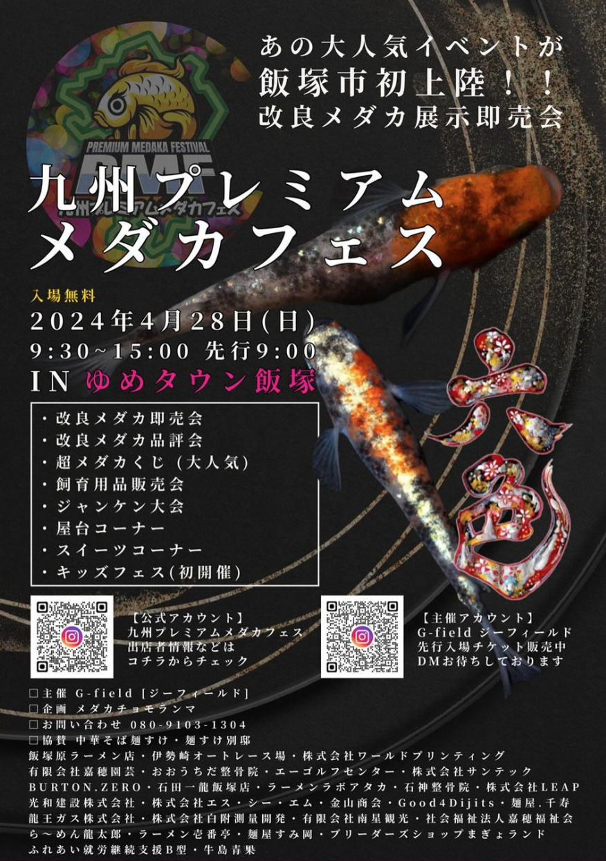| お問い合わせ | 主催/G-field お問い合わせ/九州プレミアムメダカフェス 電話 080-9103-1304 |