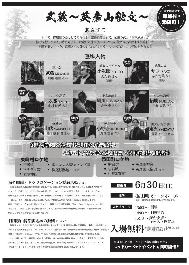 英彦山にゆかりがある宮本武蔵の物語を、東峰村・添田町の美しい景色と共にスクリーンでお楽しみください!