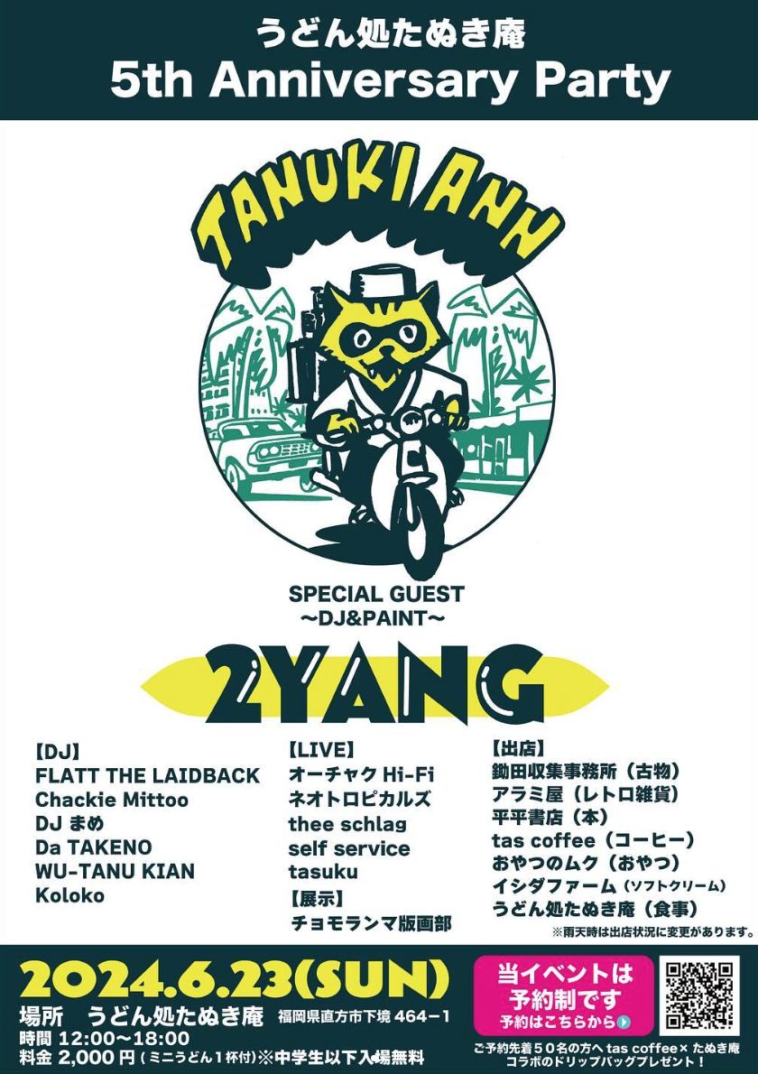 ゲストには人気バンド「くるり」のメンバーも着用で話題のたぬき庵Tシャツを手掛けた2YANGが来福。