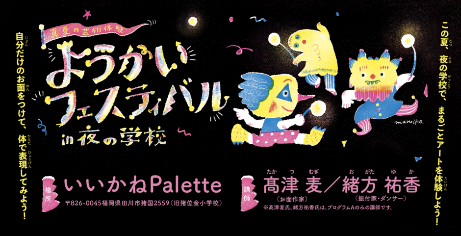 夜の学校で、お面を作ったり、真っ暗なお部屋で体を動かして表現したりしてみたりして、ようかいフェスティバルをつくるよ!つくること、表現すること、体を動かすことを通して、丸ごと芸術を体験しよう!