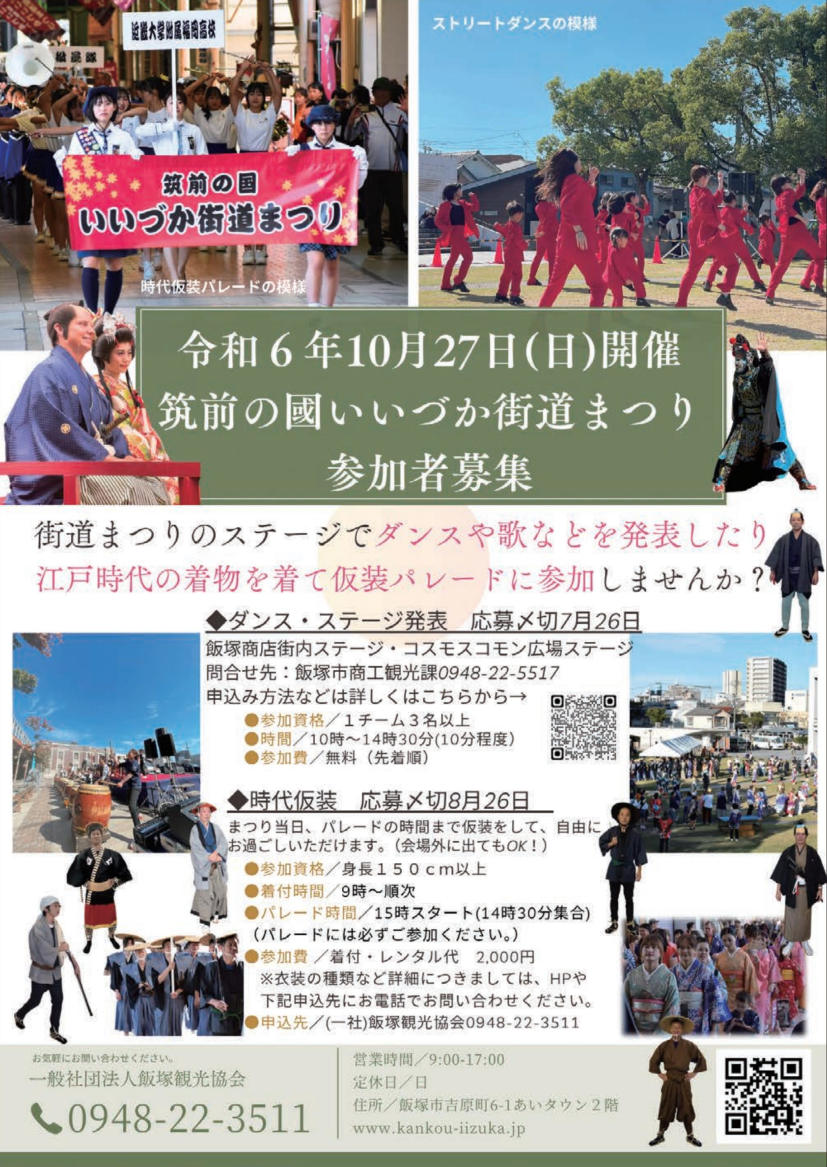 祭りの会場である飯塚市中心商店街が、かつて長崎街道の宿場町「飯塚宿」として栄えた事に関連して、さまざまな衣裳に扮した市民らの時代仮装行列をはじめ、ステージライブ、ダンス、飲食・物販などたくさんの催し物が行われます。