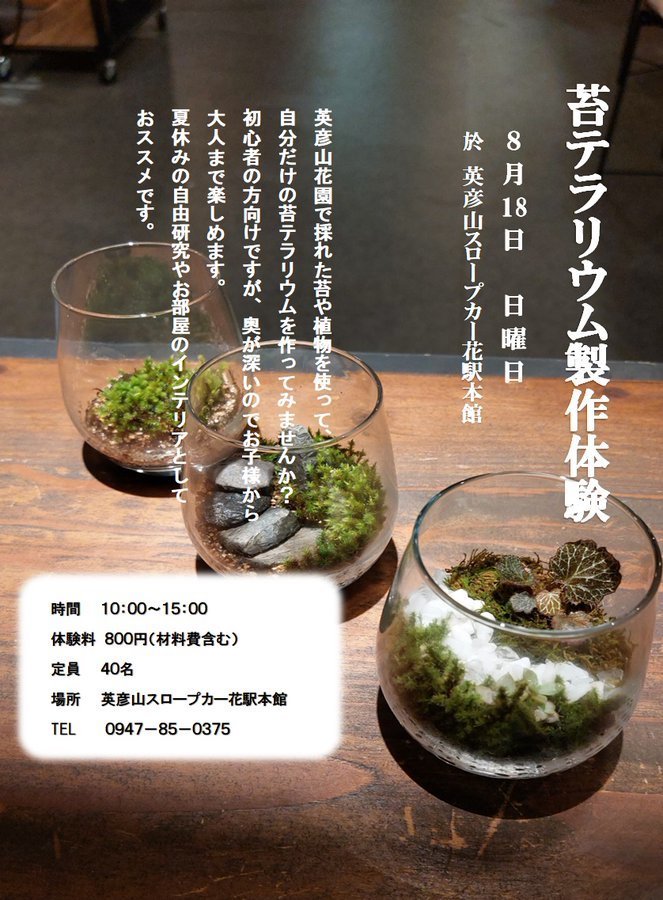 英彦山スロープカー花駅にて、英彦山で採れた苔を使った「苔テラリウム」製作体験ができるんだとか!
