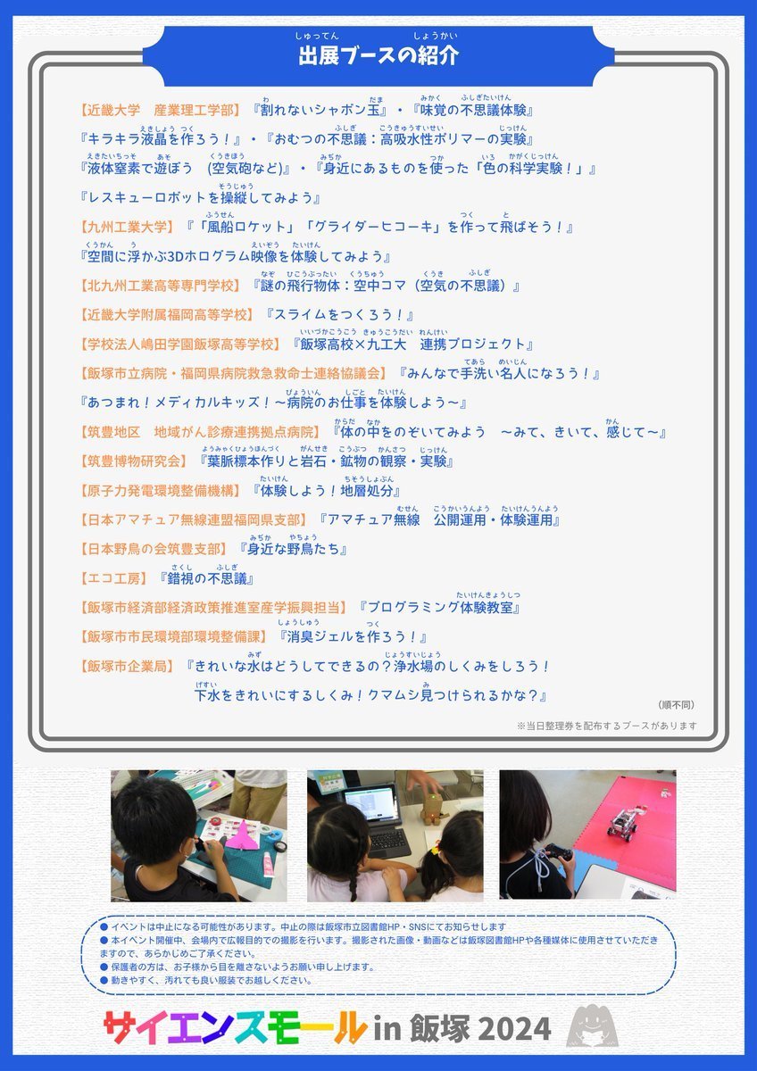 九州工業大学、近畿大学産業理工学部などさまざまな出展があり、「参加無料」「事前申込不要」で楽しむことができます◎