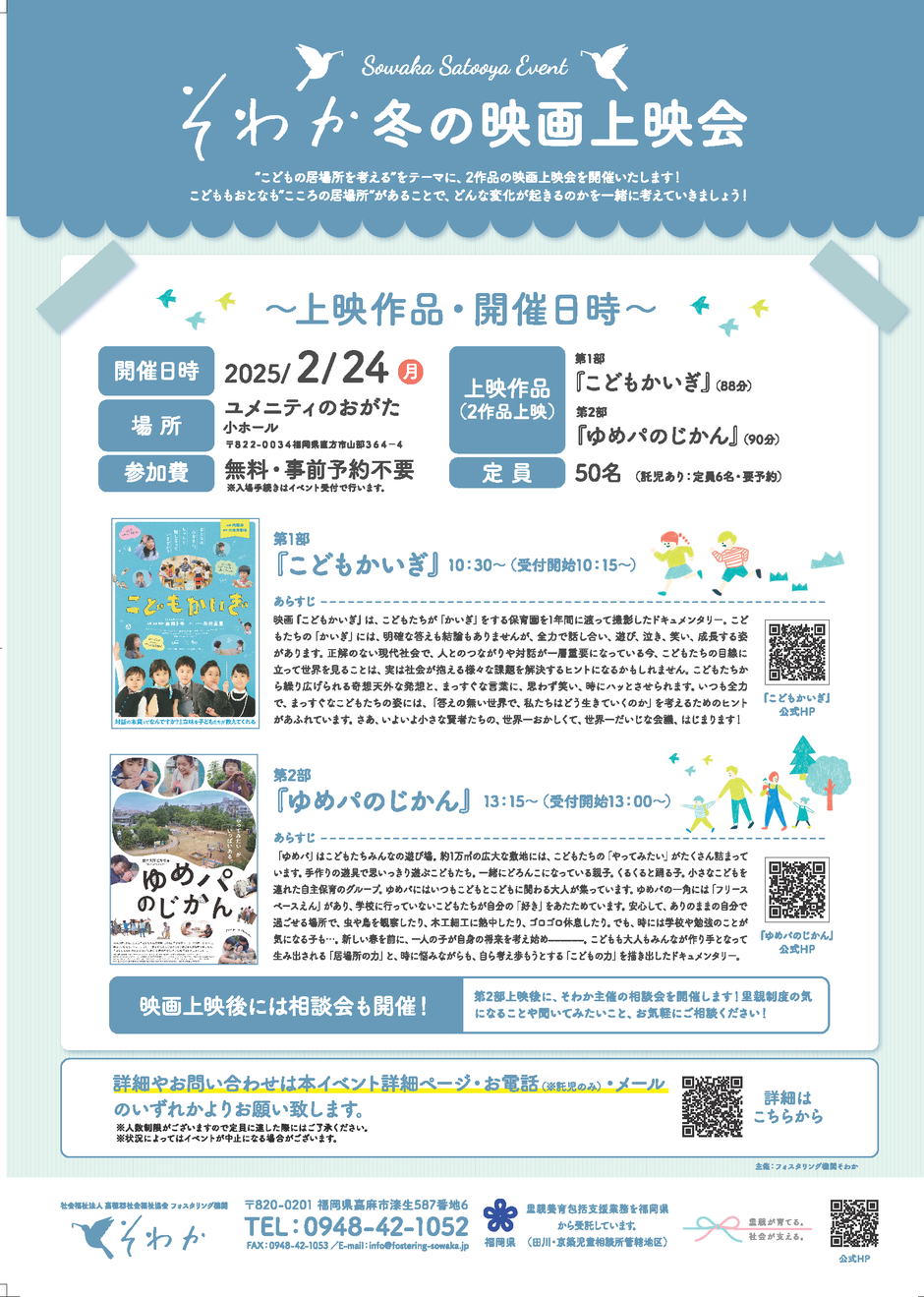 | お問い合わせ | 主催:フォスタリング機関そわか MAIL:info@fostering-sowaka.jp TEL :0948-42-1052 FAX :0948-42-1053 |