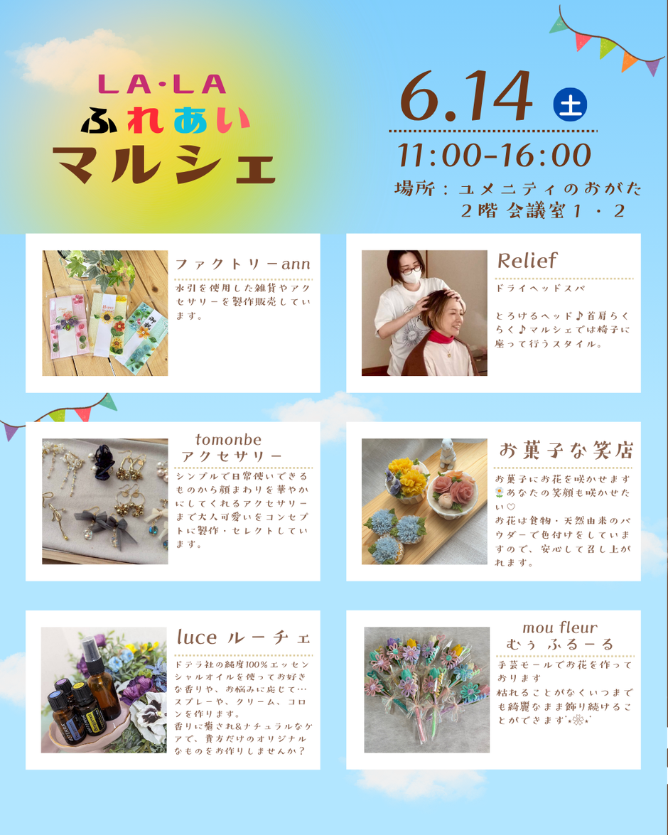 ハンドメイド雑貨・アクセサリー・カラーセラピー・ドライヘッドスパ・お菓子販売・