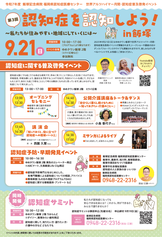 9月21日は認知症の日、飯塚記念病院 福岡県認知症医療センターはゆめタウン飯塚ンのオープンの年から、毎年1回、認知症普及啓発イベントを開催。今回は、公開介護講座、認知症サポート医による講演、タレントの齋藤ふみ氏とのトークセッションなど様々な企画を準備、そして、最後に、「はじめまして、ばあちゃん」で大人気となった、ミサンガのライブで締めくくりたいと考えています。
