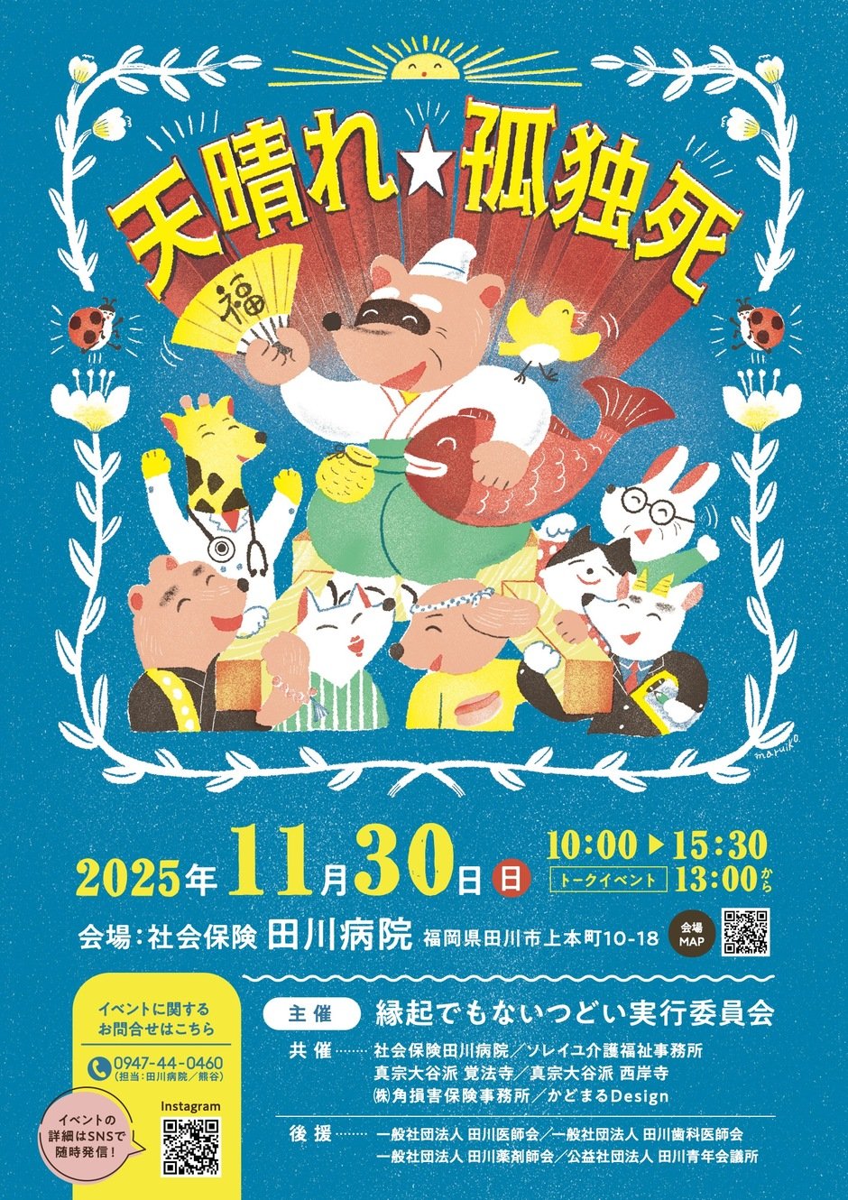 昨年、多くの反響を呼んだ終活イベント「縁起でもないつどい」が、今年は社会保険田川病院を舞台に帰ってきます。今回のテーマは「天晴れ 孤独死」。「孤独死=かわいそう」そんな誤解を見つめ直し、〝孤立死〟との違いを知ることで、今をどう生き、どう備えるかを一緒に考えてみませんか?みんなひとりで生まれて、ひとりで死ぬ。生き方も最期の迎え方も、自分らしくあっていい。少し先の未来を知ることで、今を大切に生きる力が湧いてきます。会場には、今年も筑豊エリアで活動する素敵な出店者が集う楽しみブースも!今回は納棺体験や遺影撮影会などの体験ブースも充実。肩の力を抜いて、自分や家族の“終活”のかたちを、みんなで見つけてみませんか?