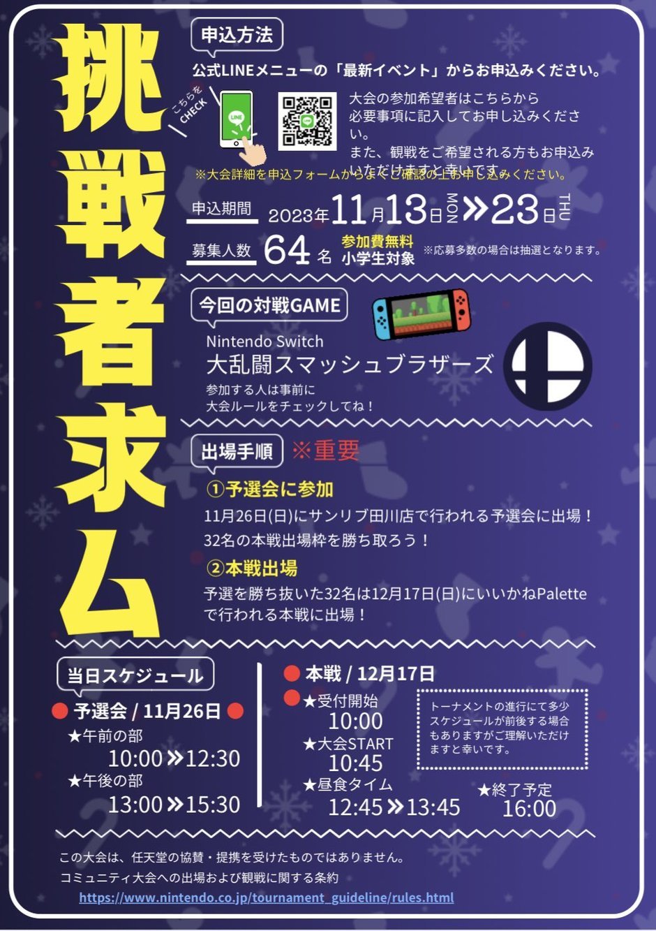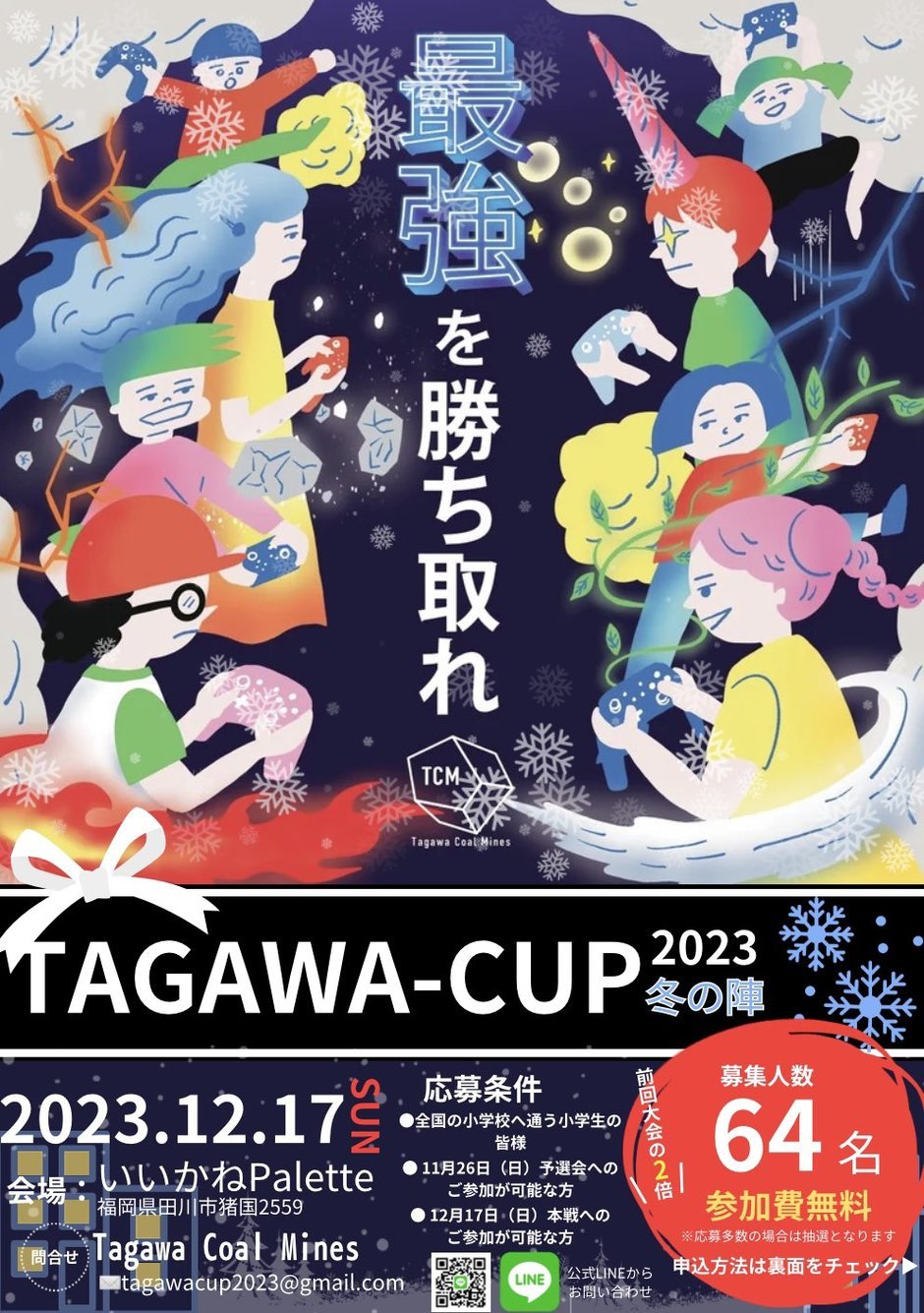 | 時間 | 11/13(月)~11/23(火):受付期間 11/26(日):予選会 inサンリブ田川店 12/17(日):本戦 inいいかねPalette |