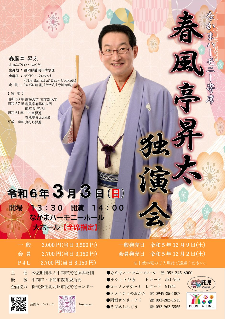 笑点の司会でおなじみの落語家、春風亭昇太師匠の独演会が中間市で開催されるみたい!