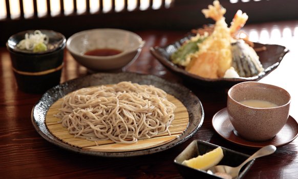 国産最高級石臼挽きそば粉を使用した麺に、研究を重ねて開発した独自のつゆ。蕎麦本来の風味を感じられるように食前にはさつま汁がベースの特製蕎麦前を頂くのが毘沙門流。