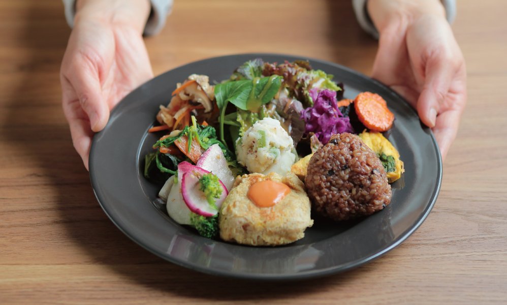 飯塚バスターミナルからほど近い場所に昨秋オープン。ここはサンカクビルヂングという三角形の建物が特徴的で、1階はルマージ、2階は飲食スペースと、まちの茶の間的コミュニティ空間の智輪(ちりん)、3階は運営会社・倖乃舎(さちのや)のオフィスという構成になっている。今回フォーカスするのは、いま話題になっているルマージの女性シェフ堀さんが手がけるランチ。「元看護師の経験から身体に良い食事に関心を持ちました。食を通して、少しでも身体を考えるきっかけと、お腹と心も満たす時間になれば」そう話す堀さんが提供するプレートは、野菜や発酵玄米・調味料に至るまで身近な地元食材を中心に丁寧に手作りされ彩りも豊か。「人と人が交流する場に」という想いも込められたルマージ。素敵な空気感が伝わってくるのは、空間や食事・つくり手だけではなく訪れる人も含めたコミュニケーションがあるからだと気付かされる。