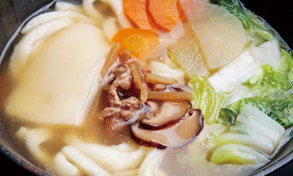 冬野菜とお餅が入った秋・冬限定の「冬うどん」。店主こだわりの自家製手打ち麺に鶏ガラと椎茸が効いた雑煮風の出汁は、最後の一滴まで飲み干したくなる優しくて上品な味わい。
