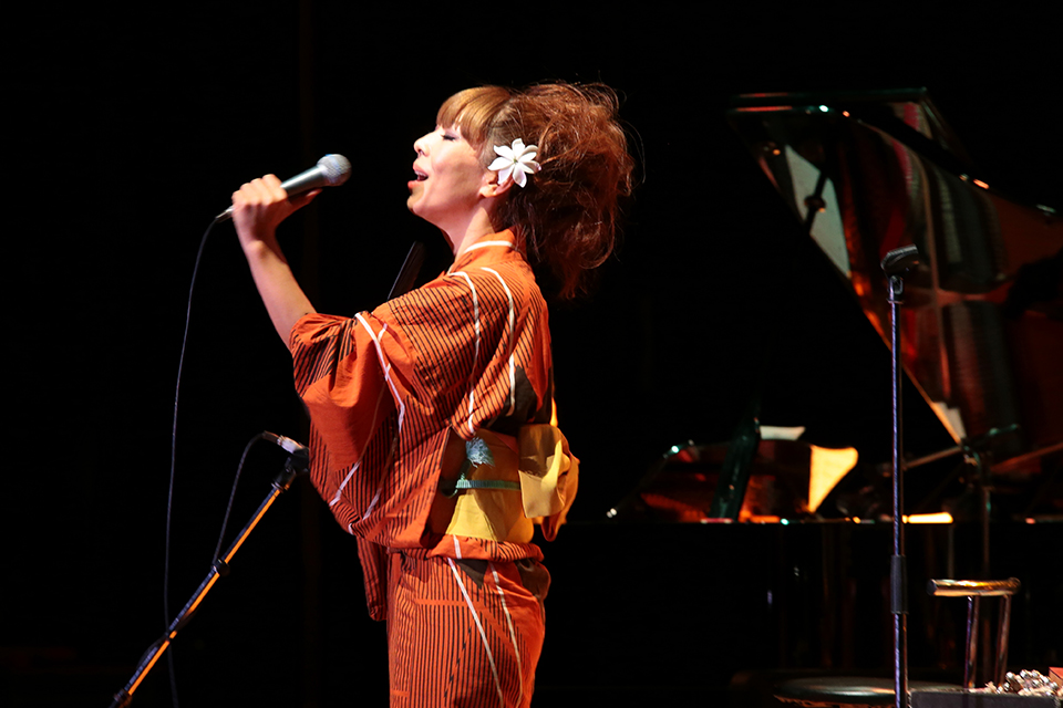 浴衣で登場したakiko。異国の雰囲気が漂う演奏は嘉穂劇場に驚くほどマッチしていた。