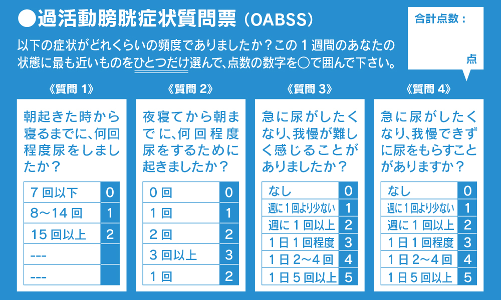 最近は新聞・雑誌で取り上げられる機会が増えましたので、病名を聞いたことのある方も多いのではないでしょうか? 具体的には「急に強い尿意が起きて我慢しにくい」というのが主な症状で、半数程度に尿失禁を伴います。我が国では40歳以上の男女全体で12%(8人に1人)、80歳以上では33%(3人に1人)の方にOAB症状があることが分かっており、比較的多くの方にみられる症状です。質問票(図1)で合計点数が3点以上かつ質問3が2点以上の場合、過活動膀胱の診断となります。内服薬による治療が可能ですのでお気軽にご相談下さい。なお留意点として、膀胱癌や結石などの他の重大な疾患が隠れており、その影響で過活動膀胱の症状を呈している場合もあります。気になる方はぜひ泌尿器科への受診をおすすめします。
