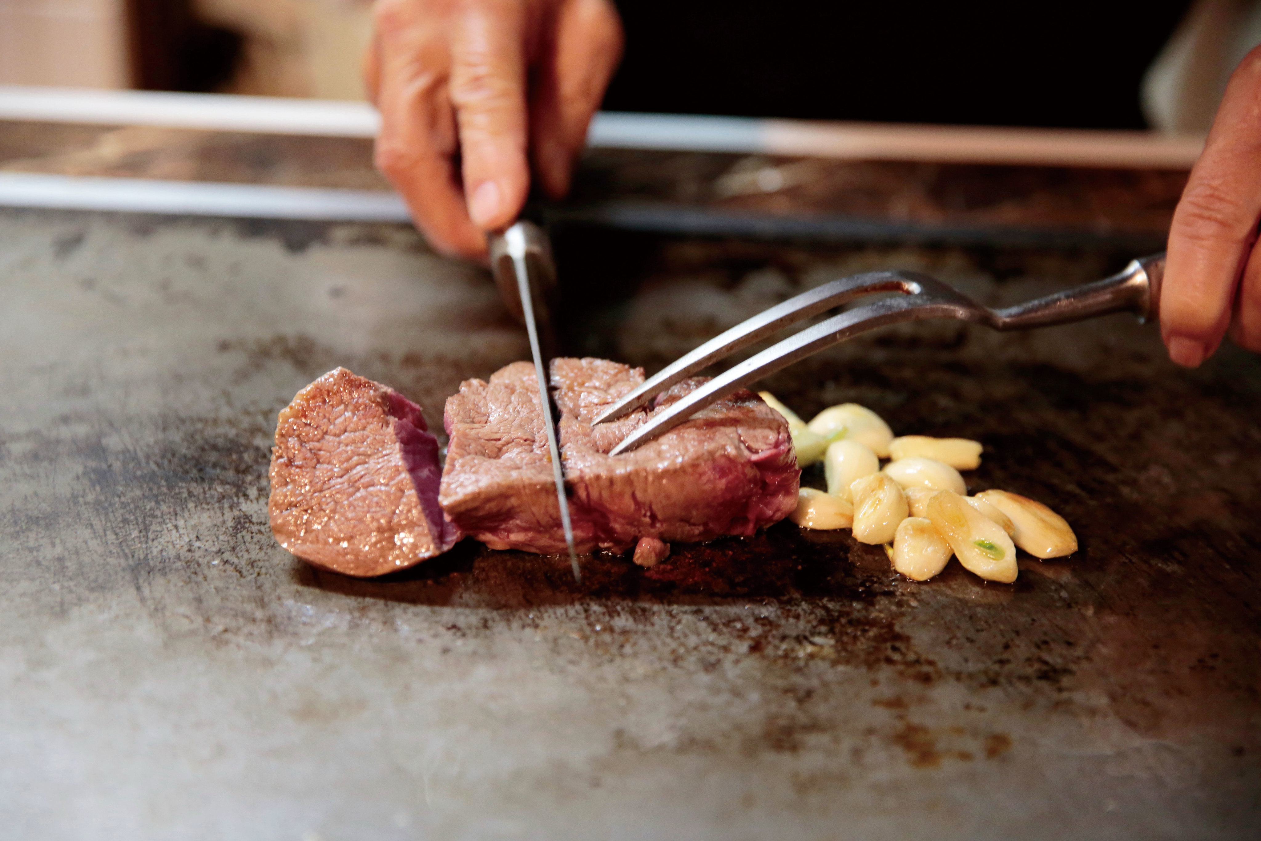 扉を開けると創業当時から変わらない大きな鉄板がお出迎え。50年の時が作り出すびいふ亭オリジナルの焼き目だ。