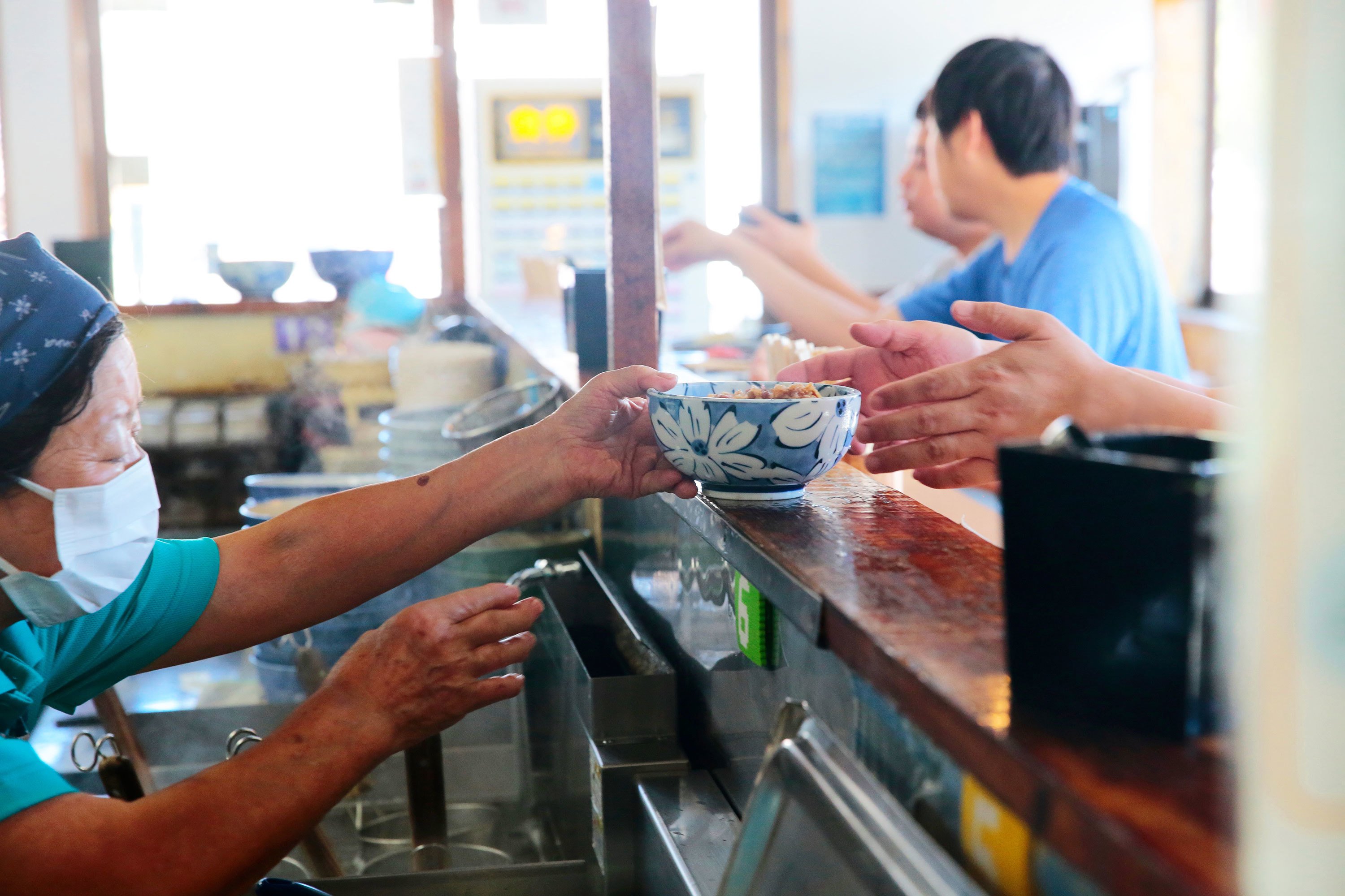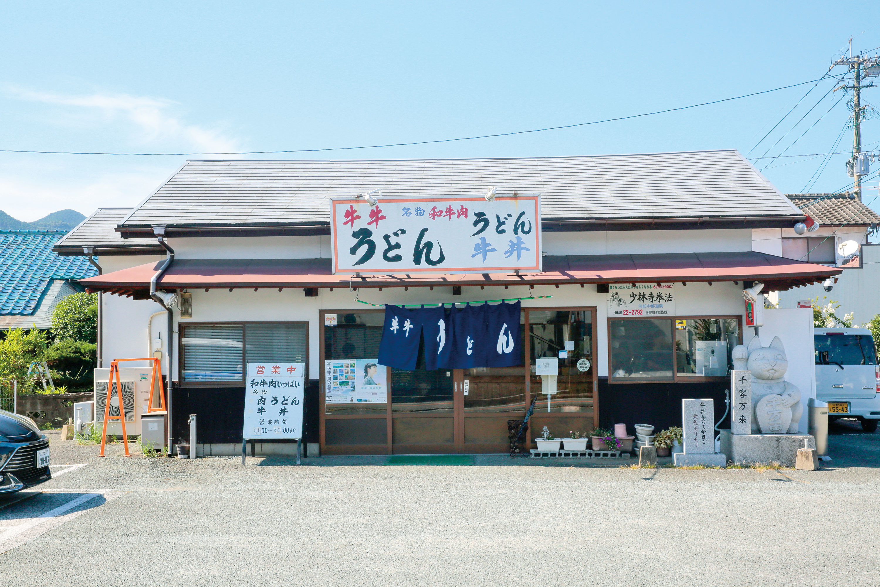 八木山峠につながる道沿いの大きな看板が目印。店主・初子さんは82歳を迎えた今も厨房に立ち続ける。店名的にまずはうどんを食べておきたいところだが、「牛丼食べて今日も 元気モリモリ」と石碑(写真右側)にして店前に飾ってあるほど、牛丼も等しく名物。テーブル席はなく、厨房を正面・右横・左横から囲むようにコの字型のカウンターが配置されている。小さな子どもからおじいちゃんおばあちゃんの代まで、各々ストイックに丼の美味しさに向き合うスタイルだ。