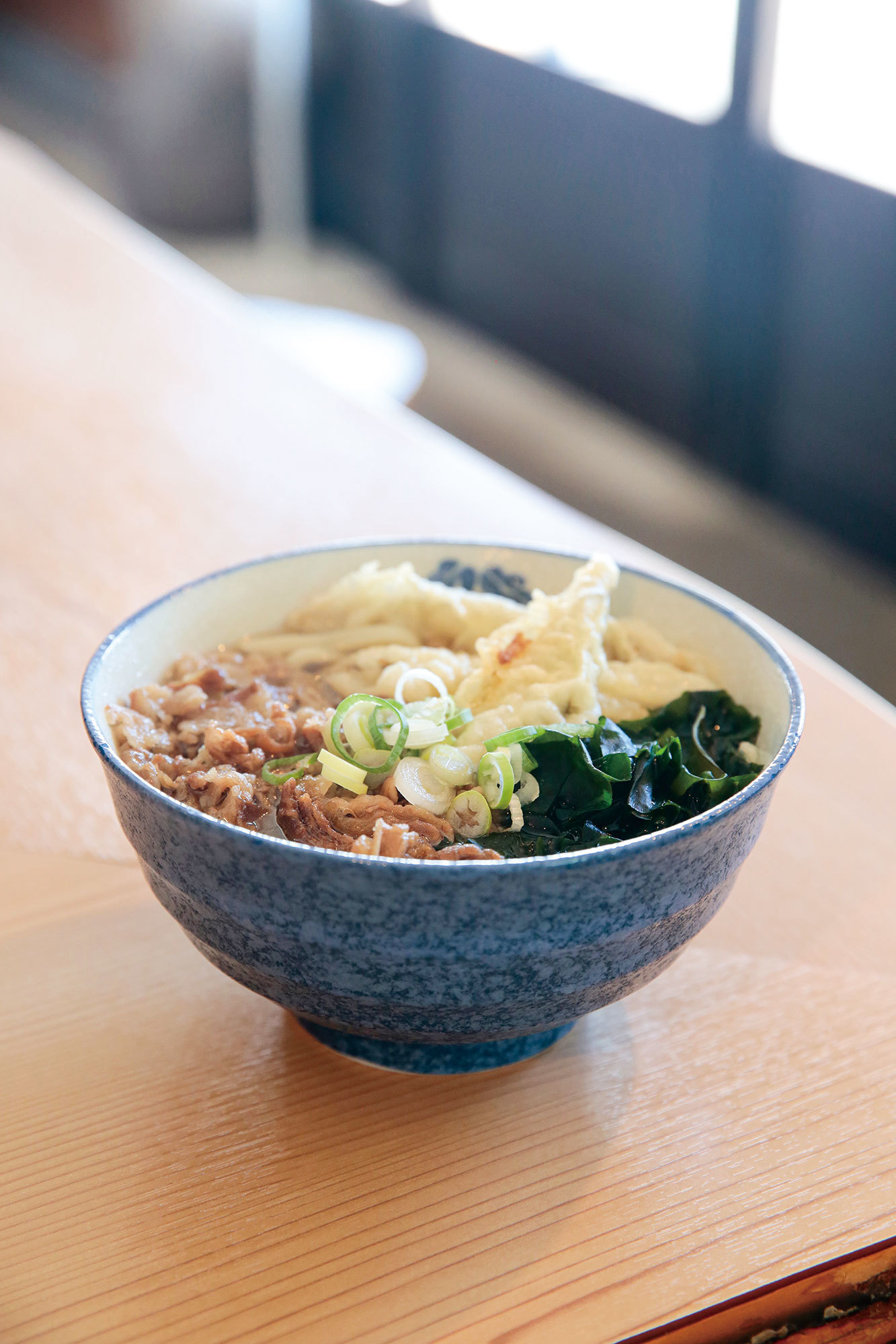 肉うどんにごぼう天とわかめもトッピングされた人気メニュー「ミックス肉うどん」800円。