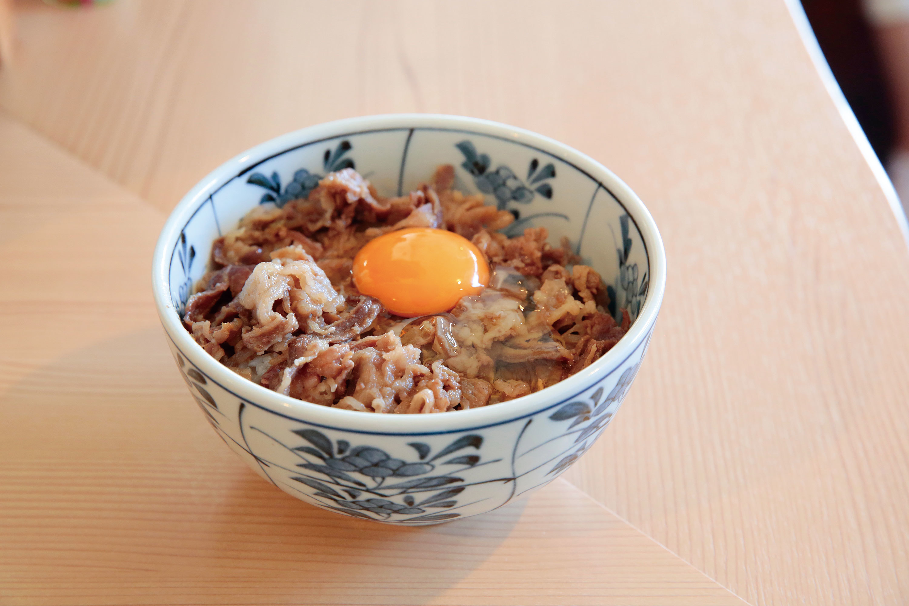 大きな電気釜で炊いたお米のふんわり食感と、牛肉のホロホロを生卵で絡める至極の一杯。「牛丼」750円(生卵は+100円)