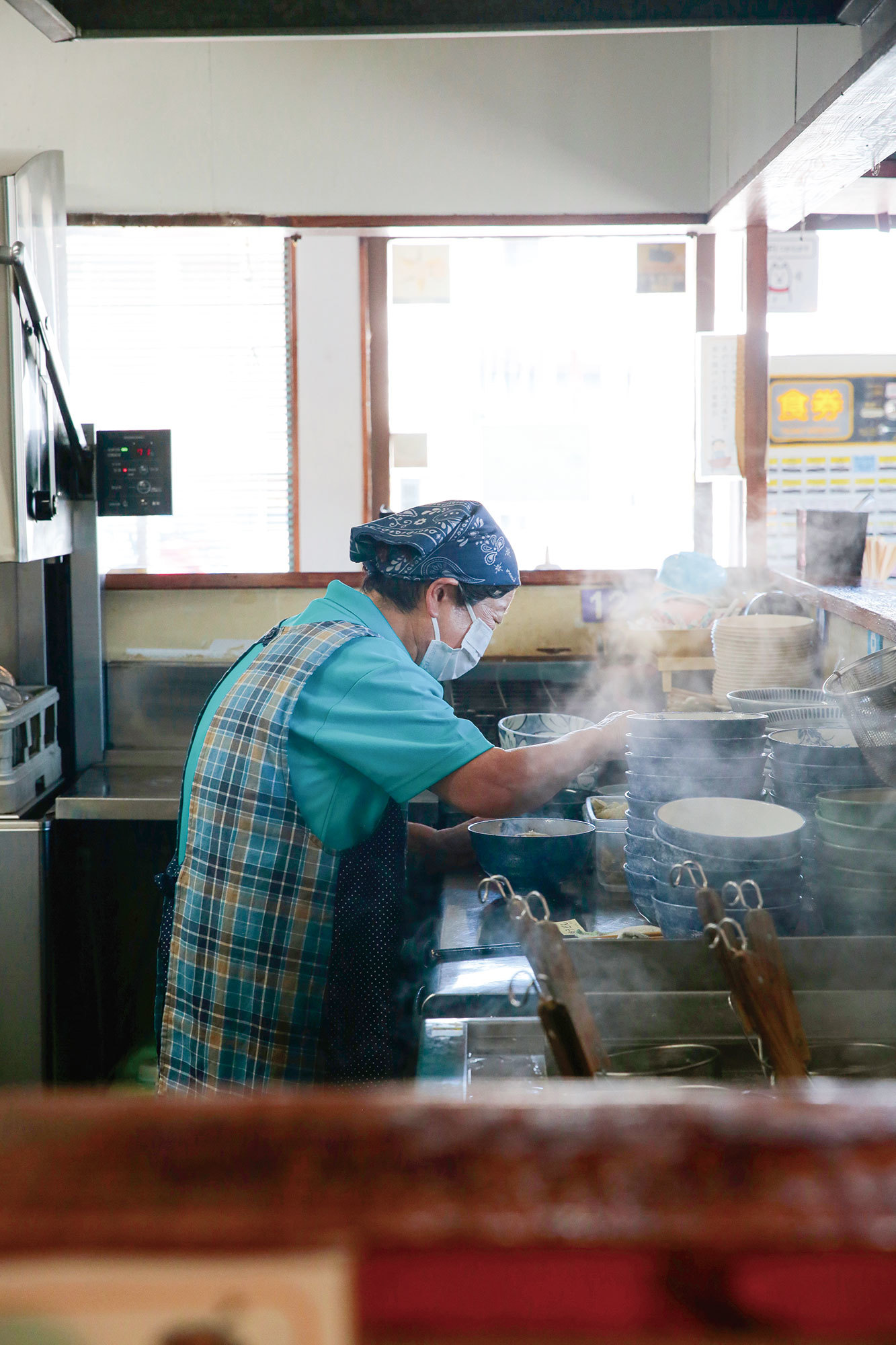 伊川交差点の一角にある駐車場から、いつも目まぐるしく出入りする車…その凄まじい回転率の中でうまく取材ができるだろうかと内心緊張しながら暖簾をくぐった。お昼時を避け14時半に伺ったが、おそらくお昼のタイミングを逃したお客さんたちがお腹を空かせて絶え間なく訪れる。