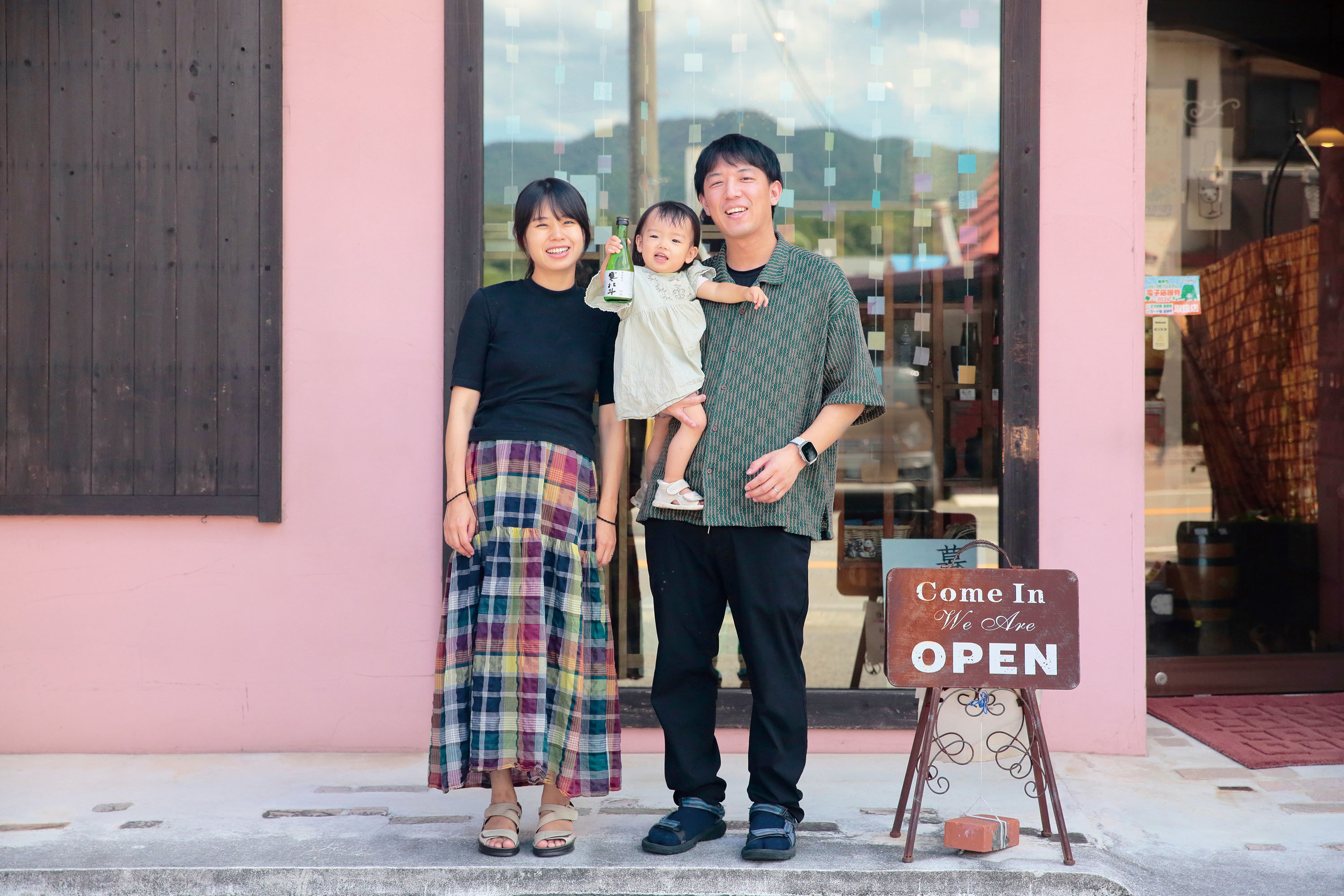 2代目である両親とともにお店を営む、3代目の倉重成崇さんと、妻の舞さん、娘の陽凪ちゃん。お酒の販売だけでなく、オリジナル商品の開発やイベント出店も行うなど、飯塚を盛り上げる存在だ。