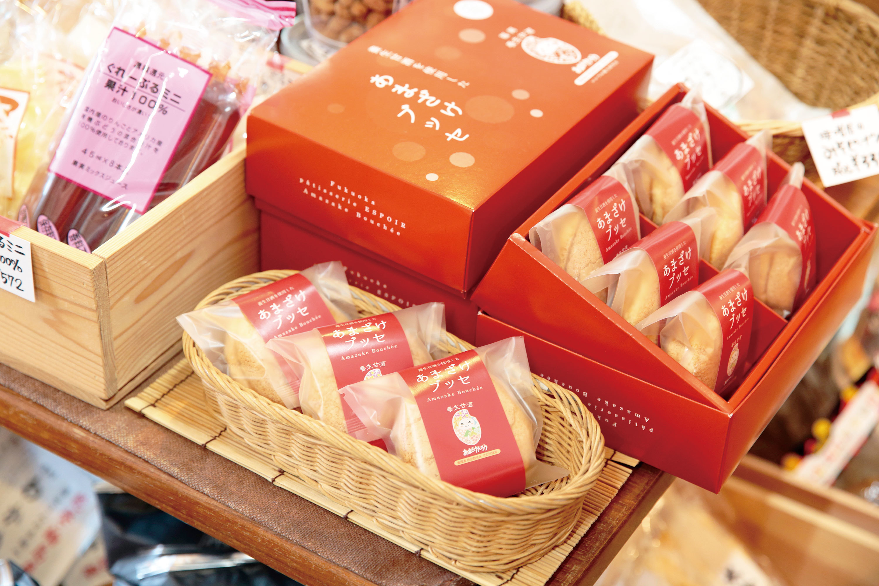 パティスリーエスポワールと共同で作ったあまざけブッセはお土産にもおすすめ。(160円)