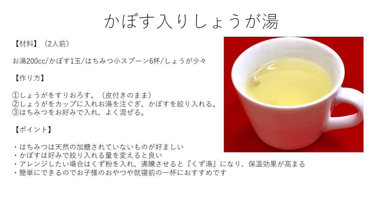 今日は、旬の食材、「しょうが」と「かぼす」、「はちみつ」を使ったしょうが湯のレシピをご紹介します。