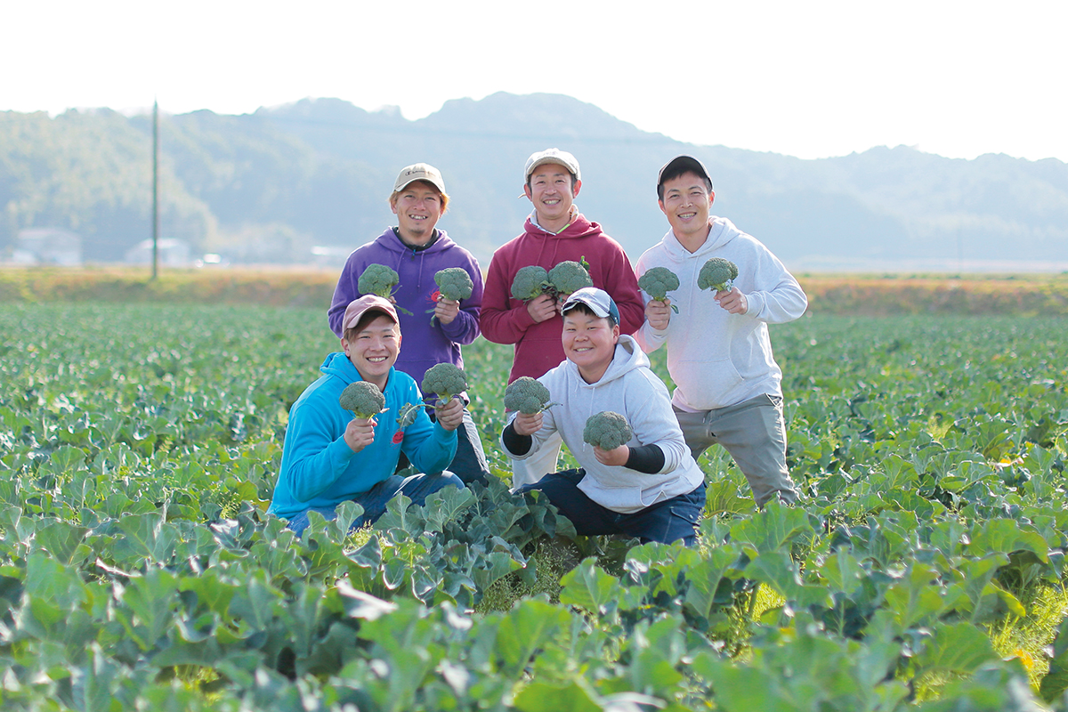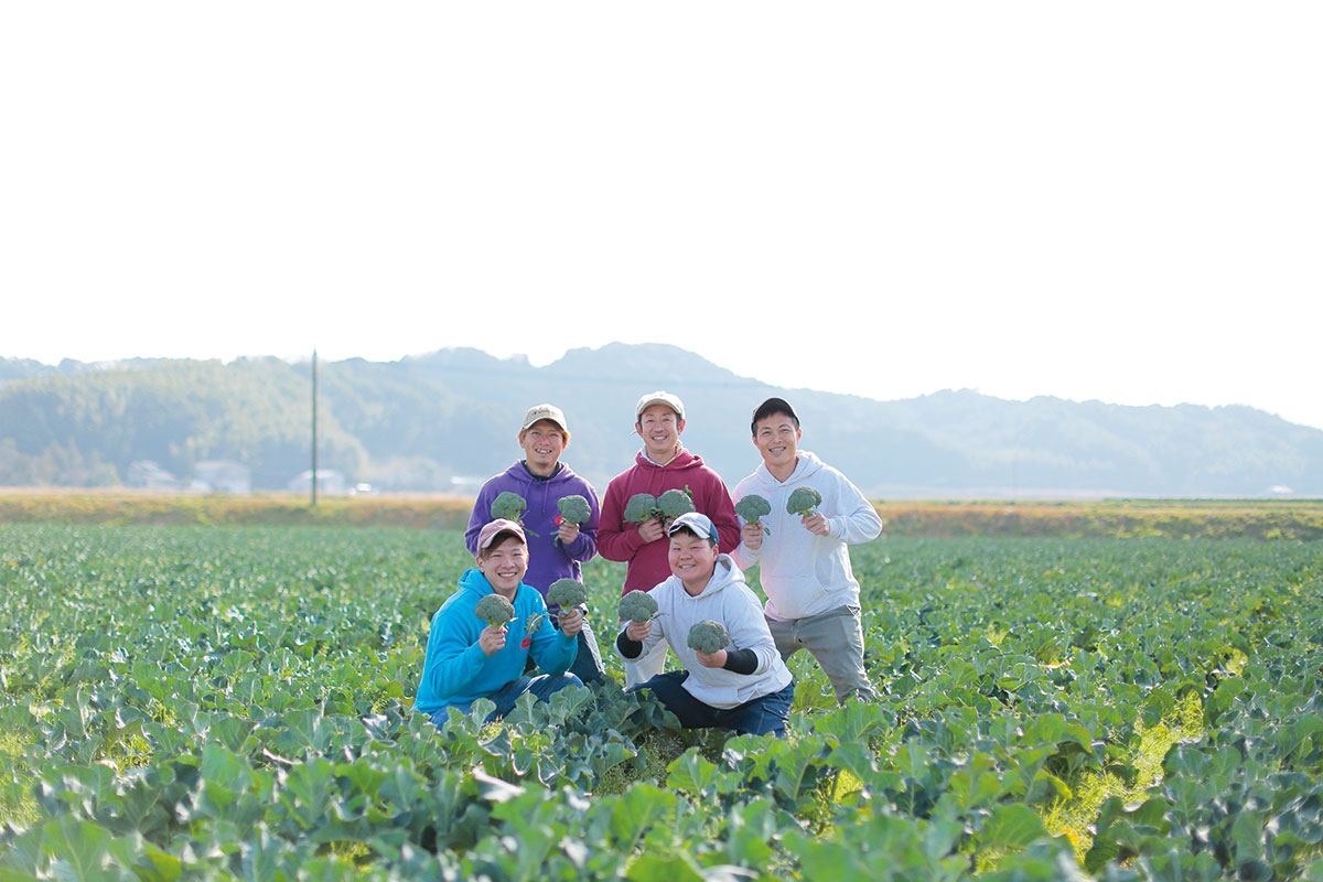 高須賀政信さんを中心に、20代〜40代の多彩なメンバーが集う若手専業農家チーム。ブロッコリーを中心に、季節ごとに多品目を栽培。
