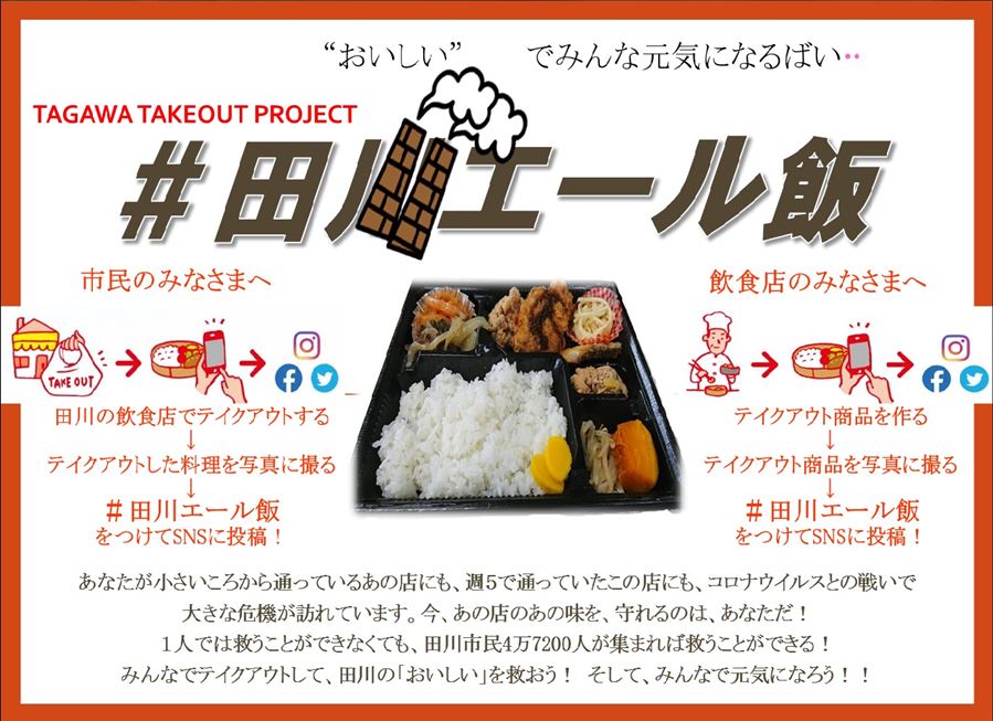 飲食店の方も田川市民の方も、紹介したいテイクアウト商品をfacebook・twitter・instagramなどのSNSに「#田川エール飯」をつけてSNSに投稿しましょう!