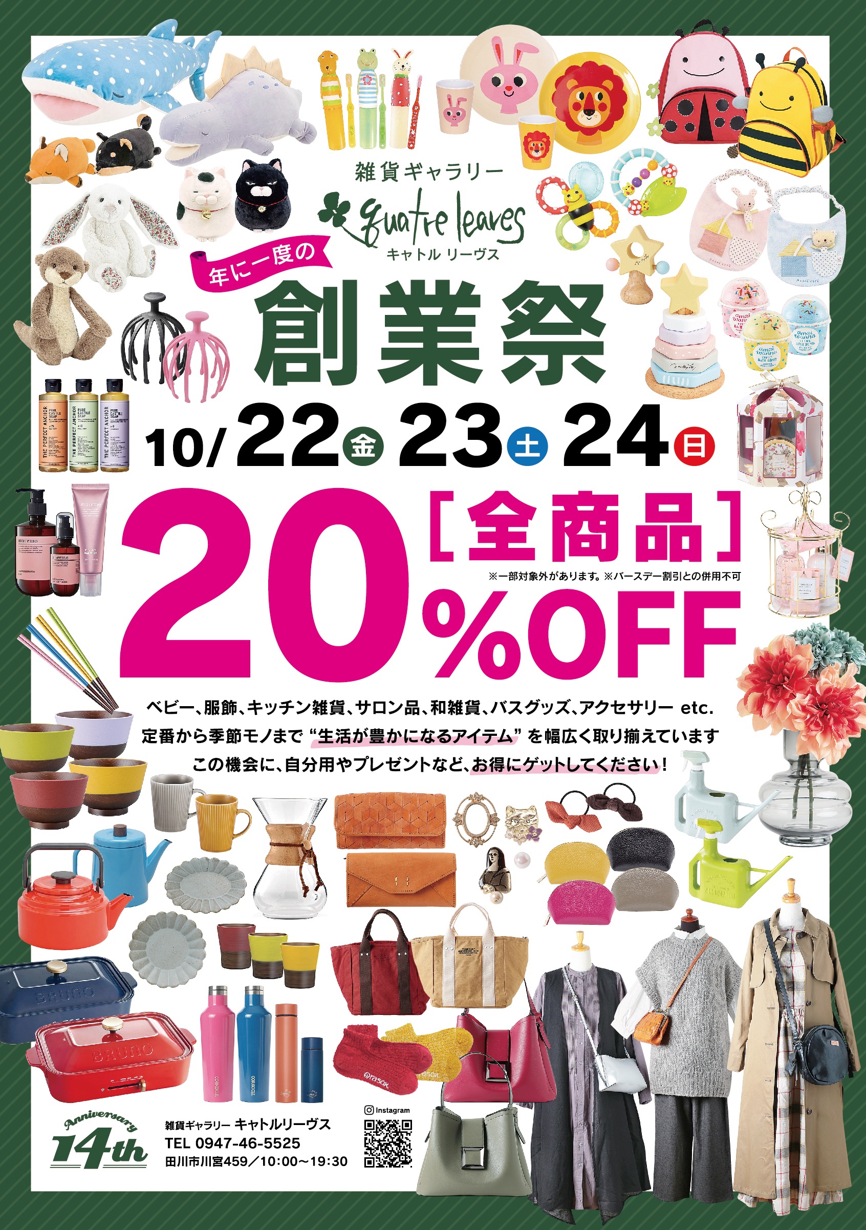 今年で14周年を迎えるこちらのキャトルリーブスが10月22日(金)からの三日間、創業祭でセールを行うらしいです。