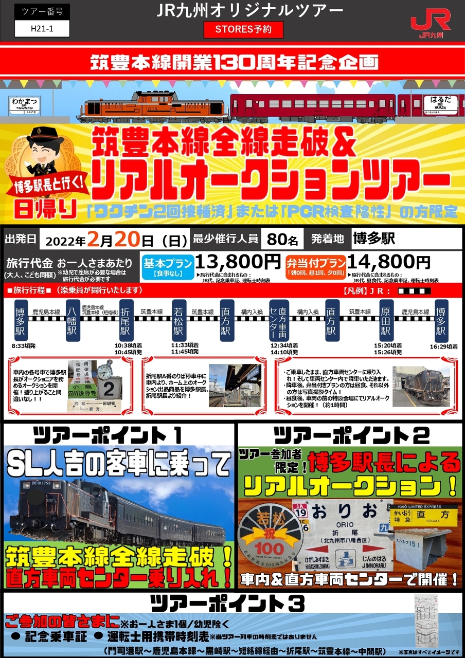 2022年2月20日(日)に筑豊本線全線開業130周年を記念して「博多駅長と行く 筑豊本線全線走破&リアルオークション ツアー」が開催されるらしいです!