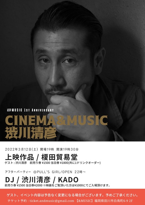 またまた、やってくれました!!以前にTOKYO NO1 SOUL SETのアーカイブ展や、渡辺俊美のライブを企画した田川の&musicが今度は渋川清彦をゲストに迎えた上映会をやってくれます。