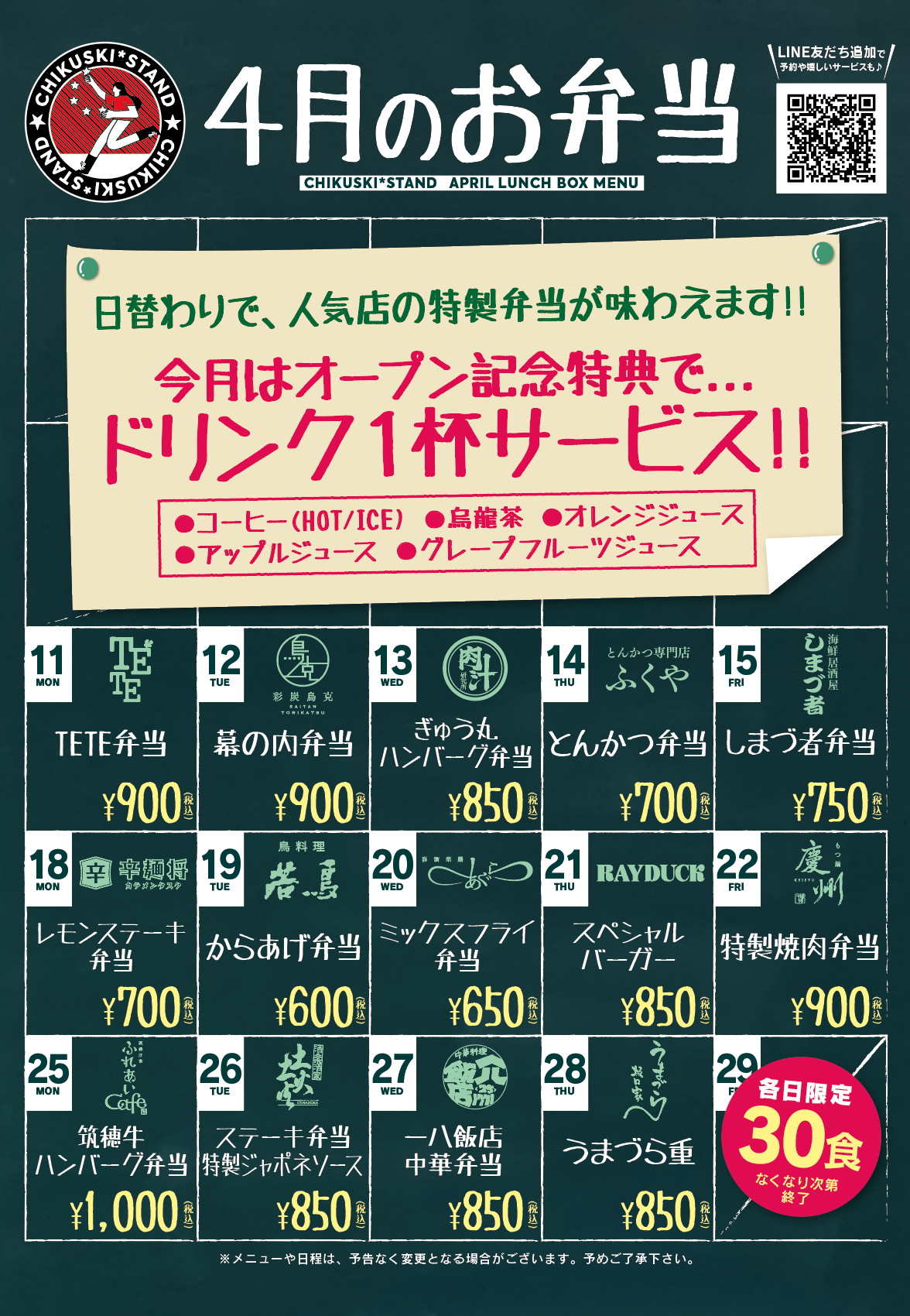 4月11日(月)に飯塚市役所二階の旧雲を蒔くの場所に、お弁当も買えるカフェ「CHIKUSKI*STAND」がニューオープンします!