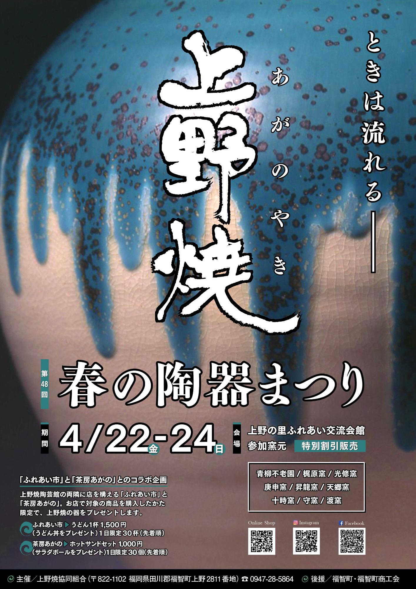 4月22日(金)~24日(日)の3日間、福智町の「上野の里ふれあい交流会館」と参加窯元で上野焼春の陶器まつりが開催されるらしい