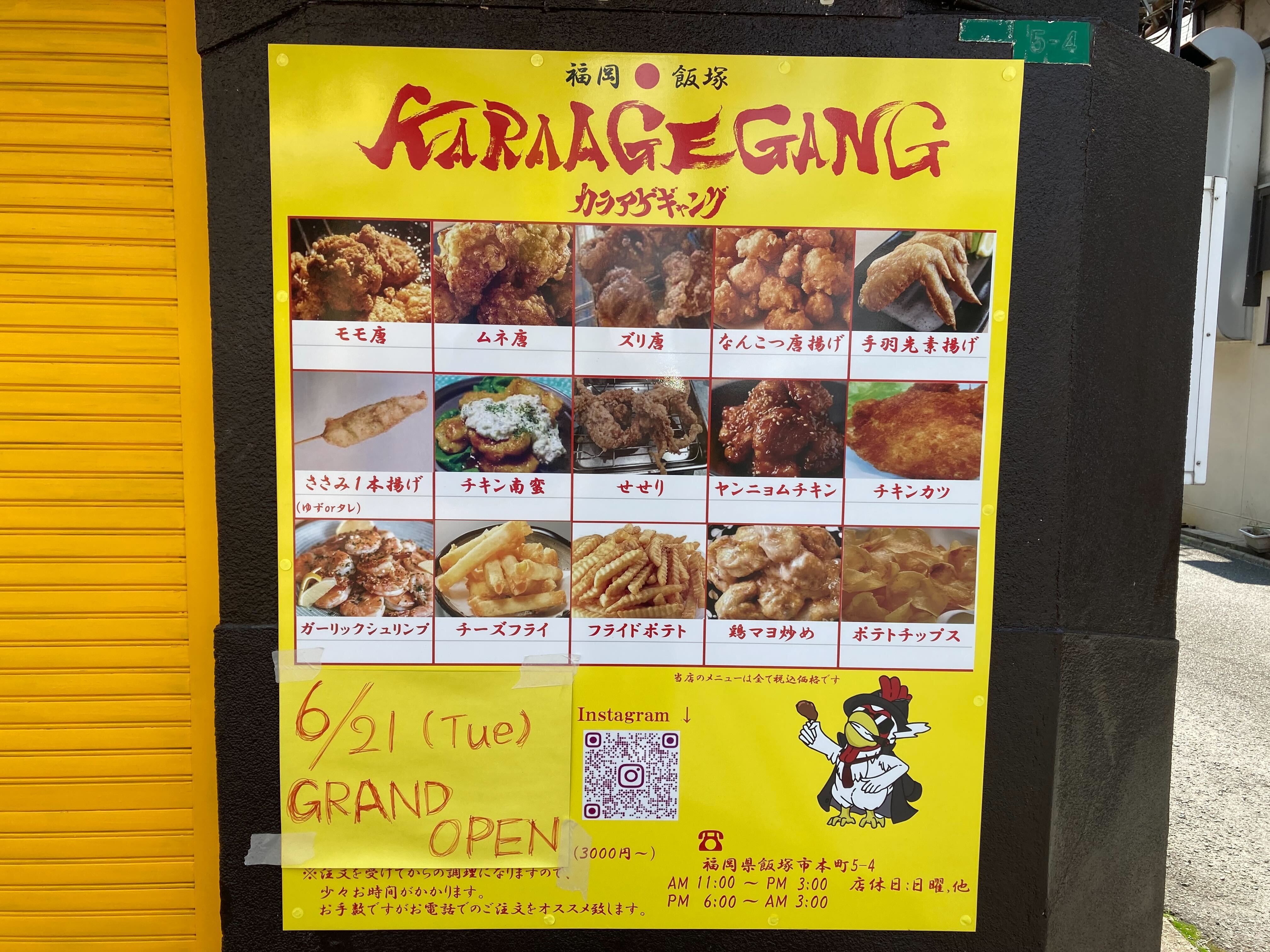 6/21に飯塚の飲み屋街に昼はテイクアウト、夜はさらに出前までやってくれる「カラアゲギャング」がオープンするらしい