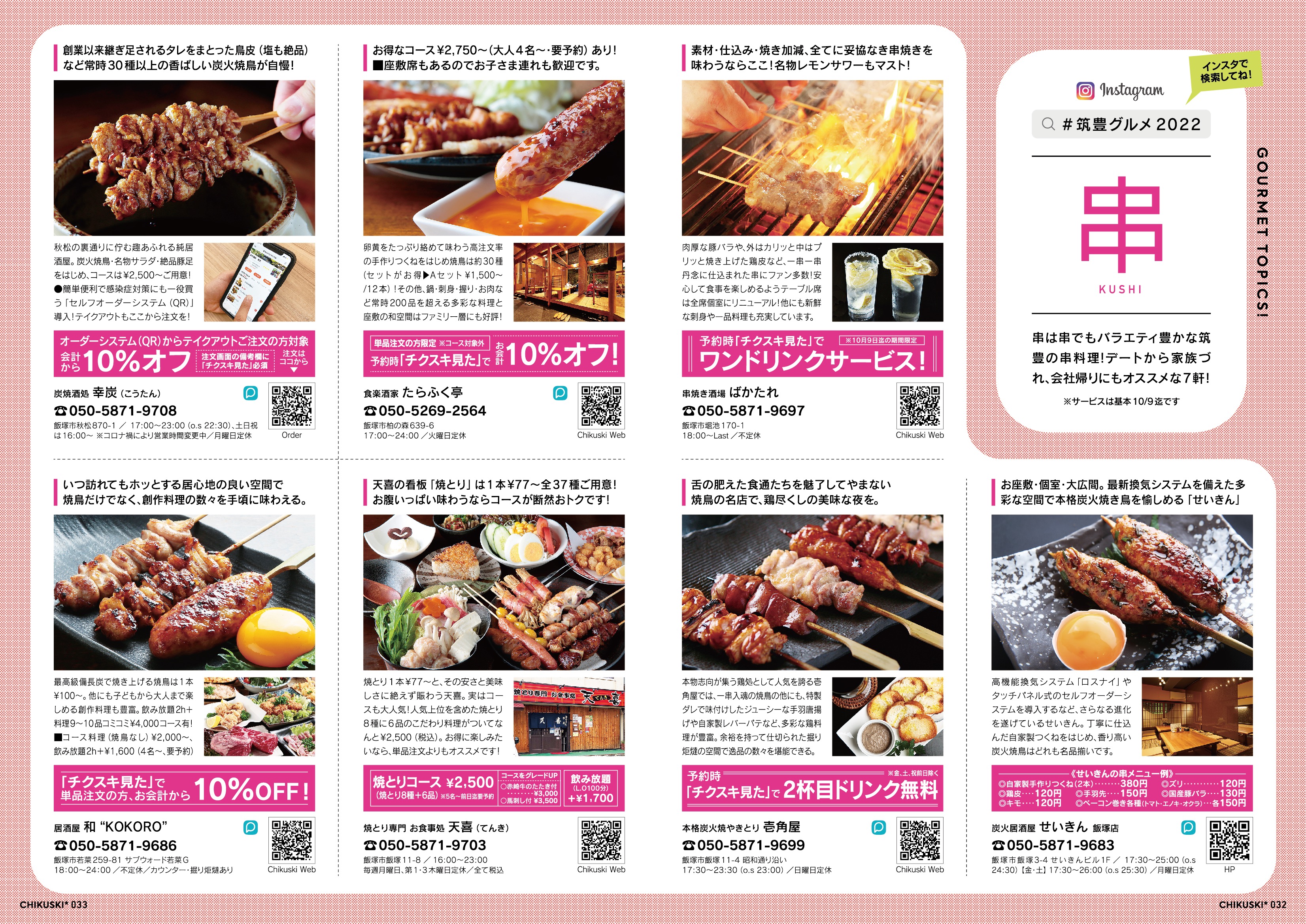 「筑豊グルメ2022」では“串・肉・魚・名物”と4つのジャンルに分けてグルメ情報をご紹介!今夜の気分に合わせてお店探しができますよ〜