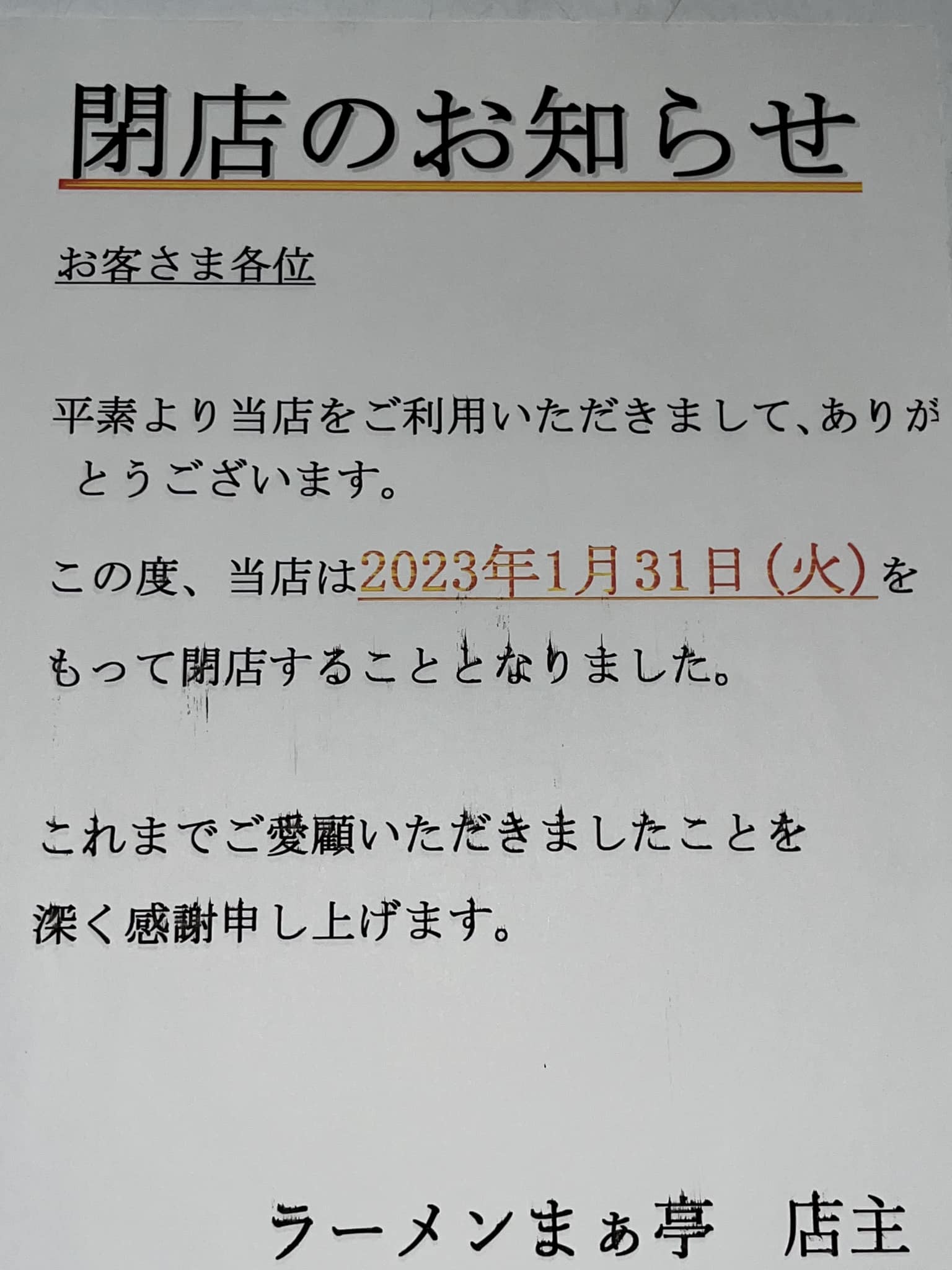 今月2023年1月31日をもって、直方の「ラーメン まぁ亭」が閉店するらしい。
